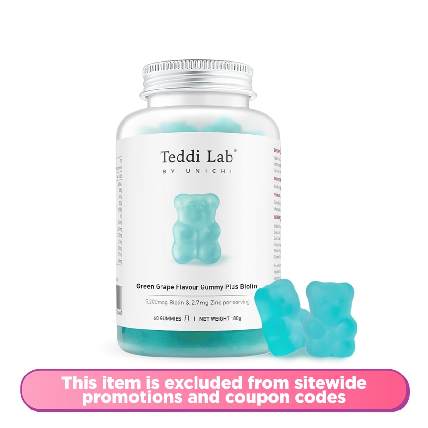 Award Winning Hair Vitamin, now enhanced with 6,000mcg Biotin and exclusive Silicassence to support visibly faster regrowth, reduce hair loss, and improve hair smoothness and strength. Unichi Teddi Lab Green Grape Flavour Gummy Plus Biotin 60s is our upgraded, next-generation hair gummy supplement, powered by 6,000mcg of Biotin and enhanced with Silicassence, Unichi’s exclusive hair-and-skin supporting complex. Together, they work to deeply nourish the scalp, fortify follicles, and promote visibly fuller, stronger hair. Expertly formulated with seven essential nutrients, including Zinc and Vitamins A, B5, C, and E, this advanced blend supports both hair density and texture by revitalizing strands from root to tip.