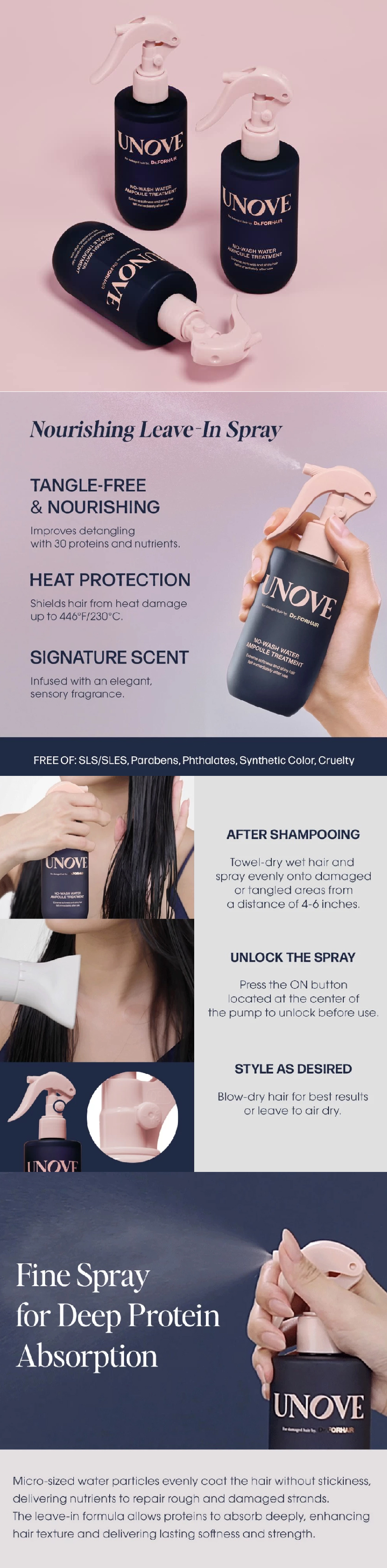 Unleash the potential of your hair with protein-rich nourishment from UNOVE. Experience bold elegance, infused with a harmonious blend of surreal softness and sensory scents. No-wash water ampoule treatment quickly supplies protein, making hair silky with a simple, no-rinse spray.
