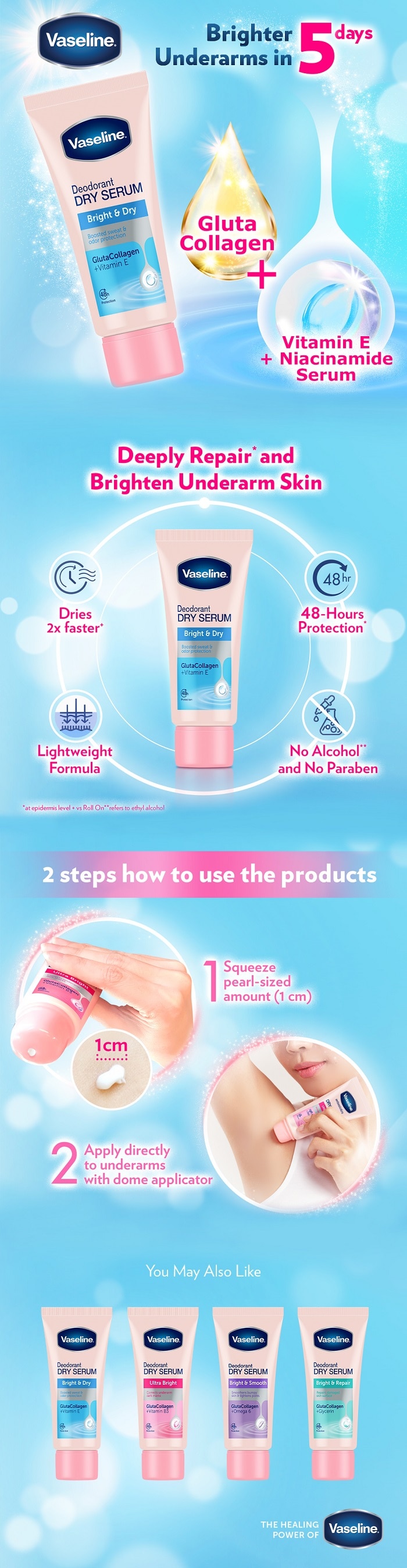 Plucking and shaving your underarms causes damage deep beneath the skin’s surface, causing skin darkening to form. Only Vaseline Deodorant Dry Serum contains unique blend of Collagen booster and Vitamin B3 that penetrates to the outer skin layer and repairs damage at the source so you get visibly whiter and smooth underarm.