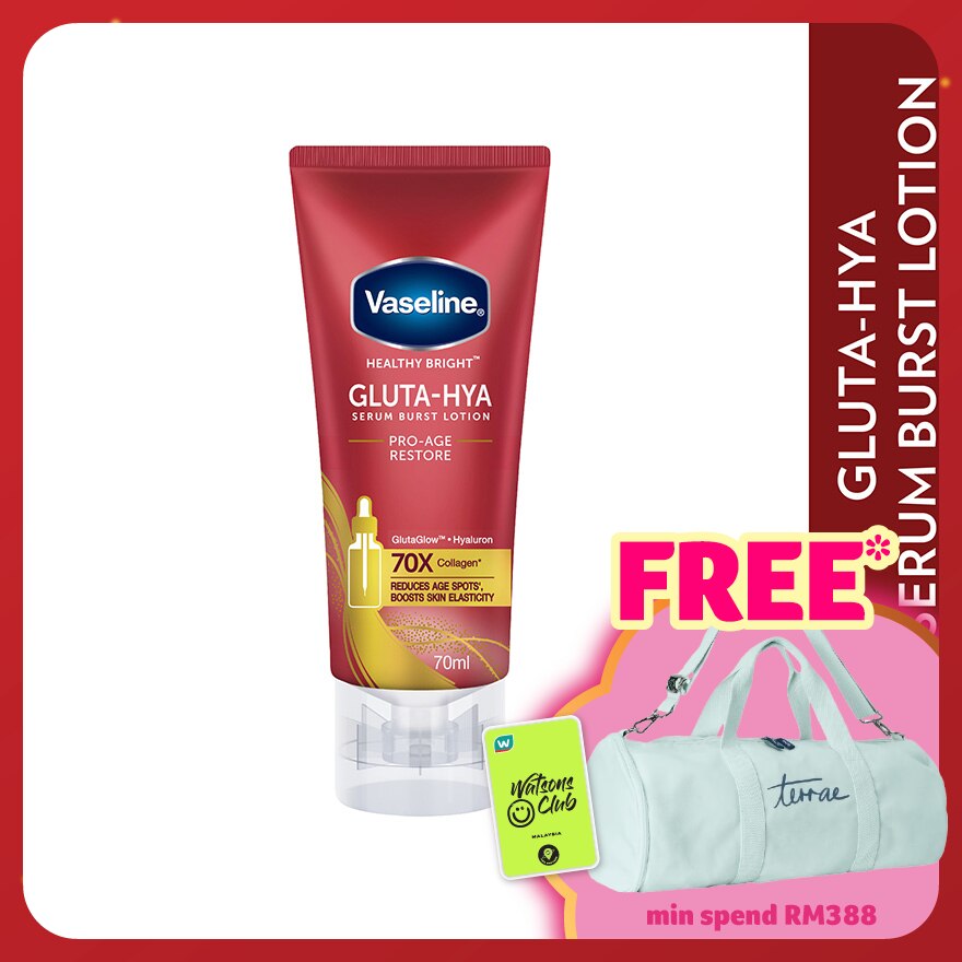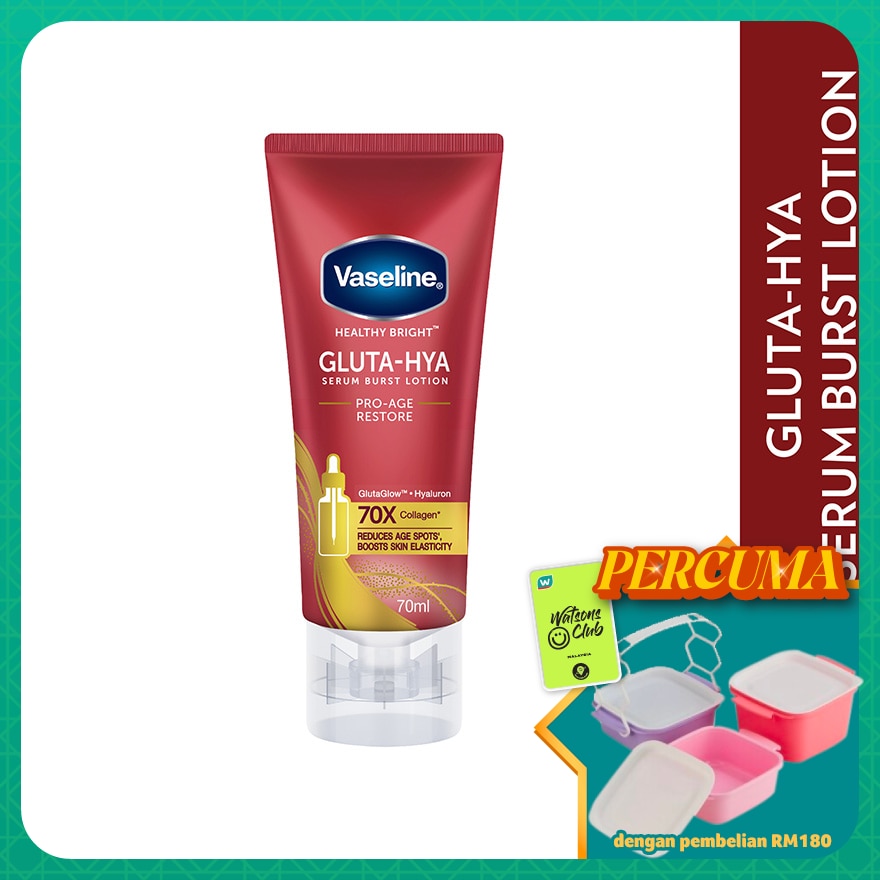 'VASELINE HEALTHY BRIGHT GLUTA-HYA SERUM BURST LOTION PRO-AGE RESTORE. GLUTAGLOW, HYALURON. 70X COLLAGEN*. REDUCES AGE SPOTS, BOOSTS SKIN ELASTICITY