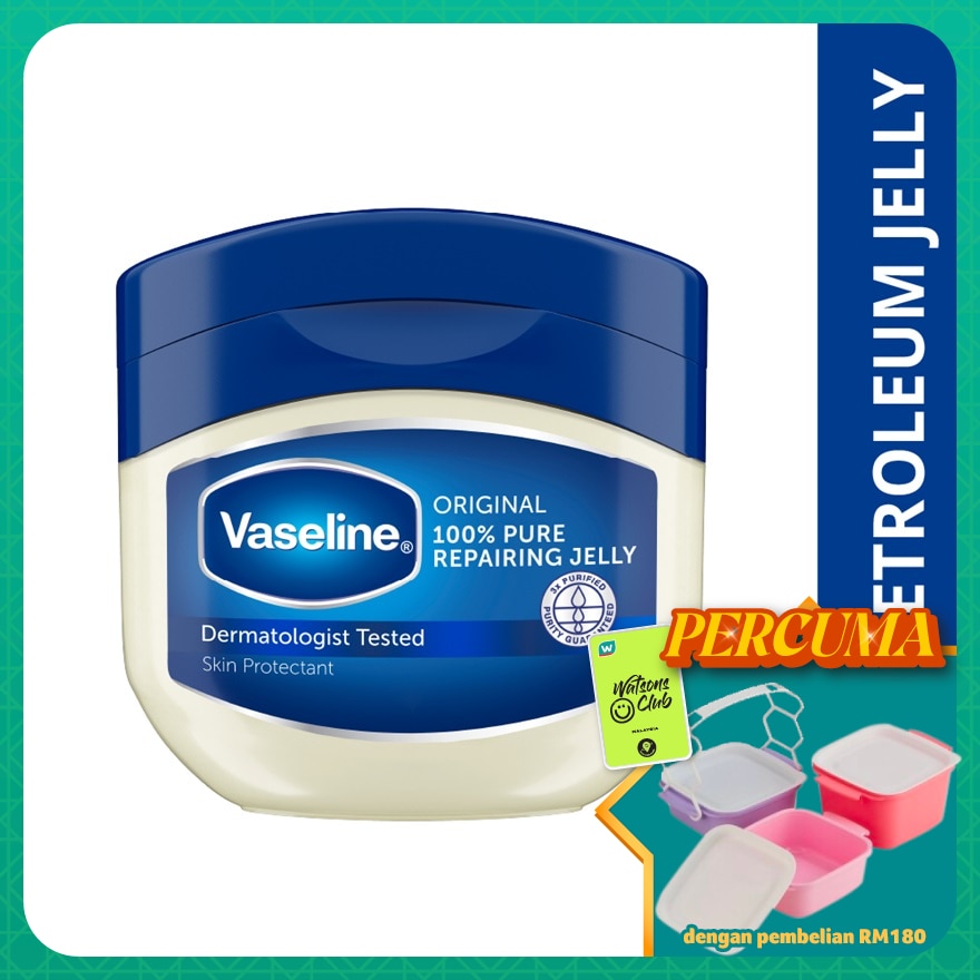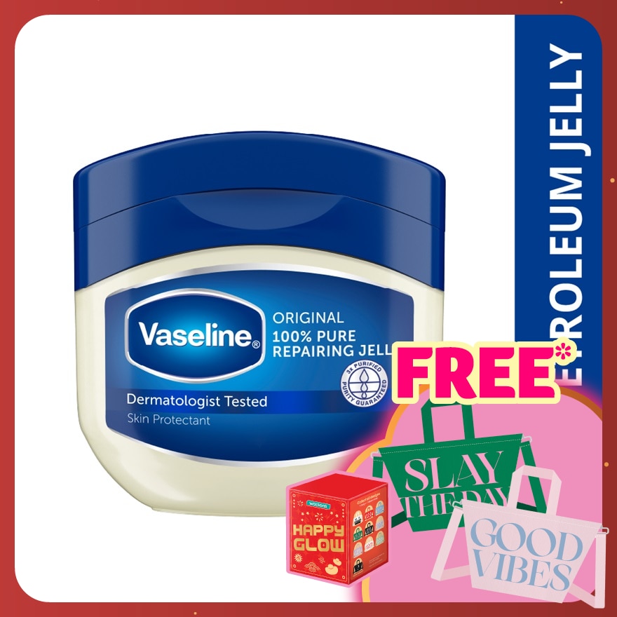 Vaseline Original Repairing Jelly is clinically proven to help restore dry, damaged skin. Made with 100% pure petroleum jelly. Purity guaranteed with our triple-purified formula. Helps provides dry skin relief and protect minor cuts. Softens rough skin areas like elbows and knees. Moisturises lips to relieve chapping. Gentle on skin, hypoallergenic and non-comedogenic. Best For : Dry Skin, Dry Itchy Skin, Chapped Lips, Diaper Rash