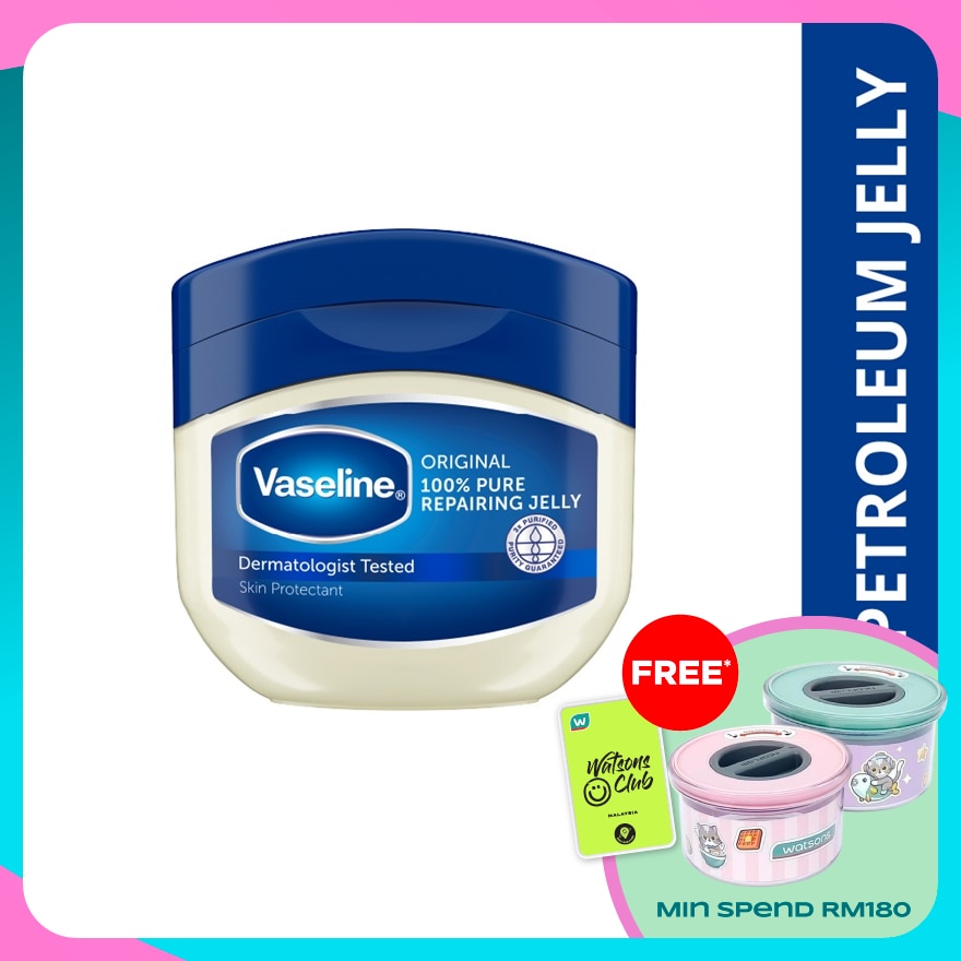 Vaseline® Original 100% Pure Repairing Jelly is clinically proven to help restore dry, damaged skin • Made with 100% pure petroleum jelly. Purity guaranteed with our triple-purified formula • Helps provides dry skin relief and protect minor cuts • Softens rough skin areas like elbows and knees • Moisturises lips to relieve chapping • Gentle on skin, hypoallergenic and non-comedogenic • Best For : Dry Skin, Dry Itchy Skin, Chapped Lips, Diaper Rash