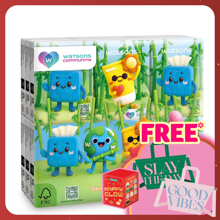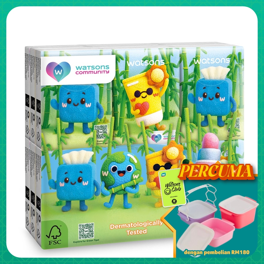 Watsons Tissue harnesses the power of 4-EXTRA SOFT-TECH, making it *"EXTRA" SOFT, STRONG, ABSORBENT and SMOOTH for a richly cushioned feel. By using fast-growing, natural, unbleached bamboo pulp with FSC certification instead of wood pulp, we're contributing to sustainable forestry. We also guarantee that all tissues are dermatologically tested and proven safe for sensitive skin.