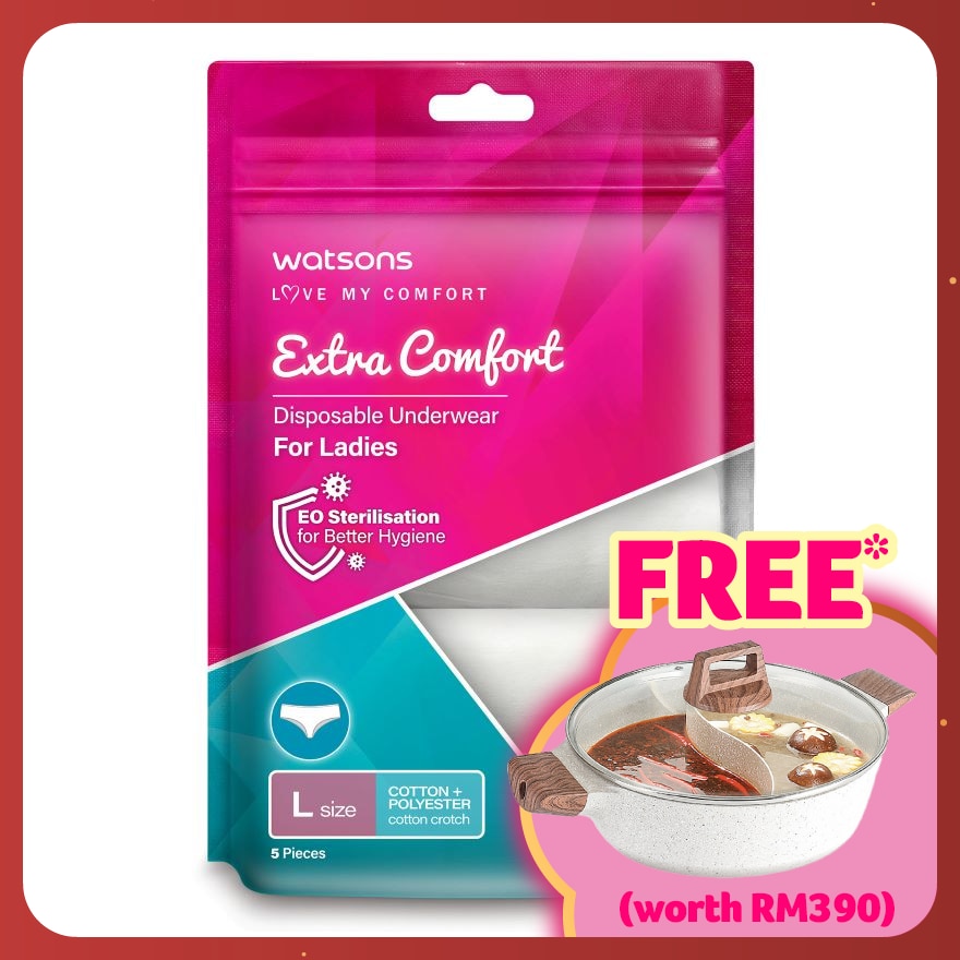 Watsons Extra Comfort Disposable Underwear (Ladies - L Size) is 15% cotton + 85% polyester, breathable & sweat absorbent, cotton crotch for extra protection, for single day use only.
