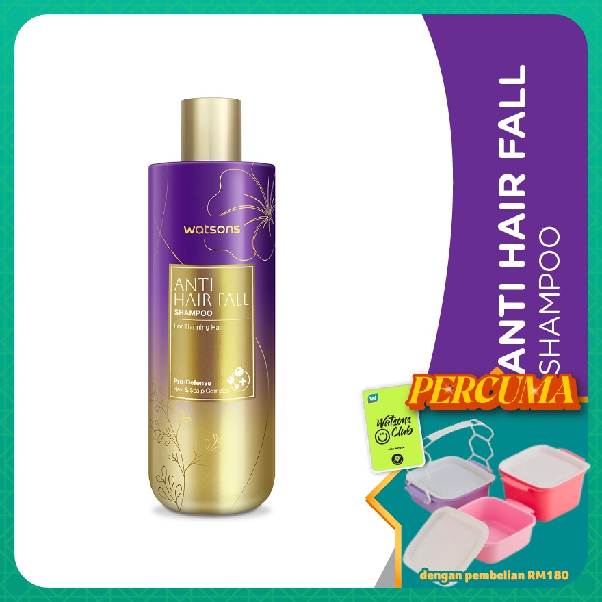 Strengthen hair and reduce fall with Watsons Anti-Hair Fall Shampoo. It fortifies strands, promotes a fuller appearance, and protects against environmental stressors for strong and healthy hair.