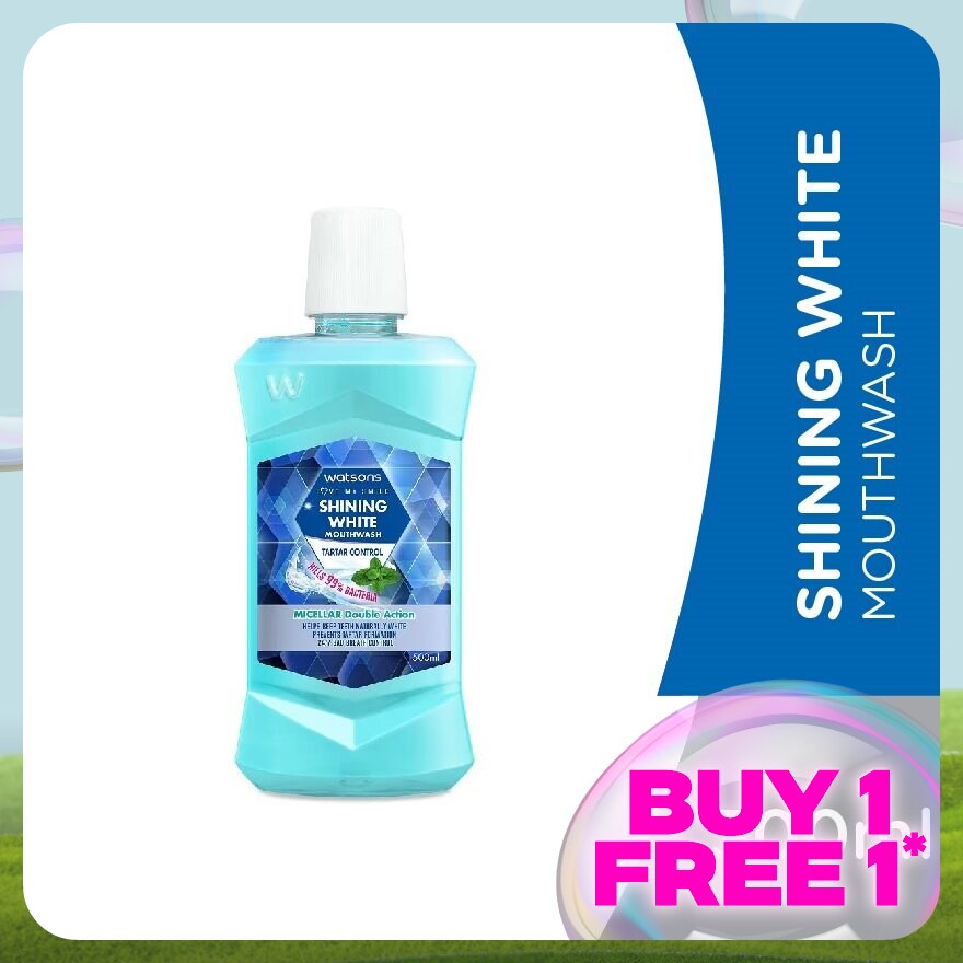 Promote a reduced usage of virgin materials by using recycled content instead This bottle is made with 50% recycled plastic Watsons Shining White Mouthwash helps reduce plaque that hardens and leads to tartar. By reducing the yellowish-brown stains caused by tartar, this mouthwash helps keep teeth naturally white. It helps clean hard to reach places for a fresher and healthier oral cavity enviroment.