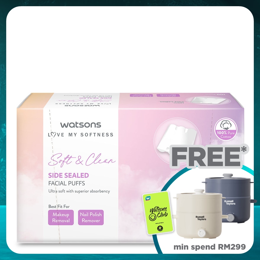 Watsons Side Sealed Facial Puffs is made from lint free, premium quality cotton. The side sealed design ensure no residue cotton fibres are left on your face after use.