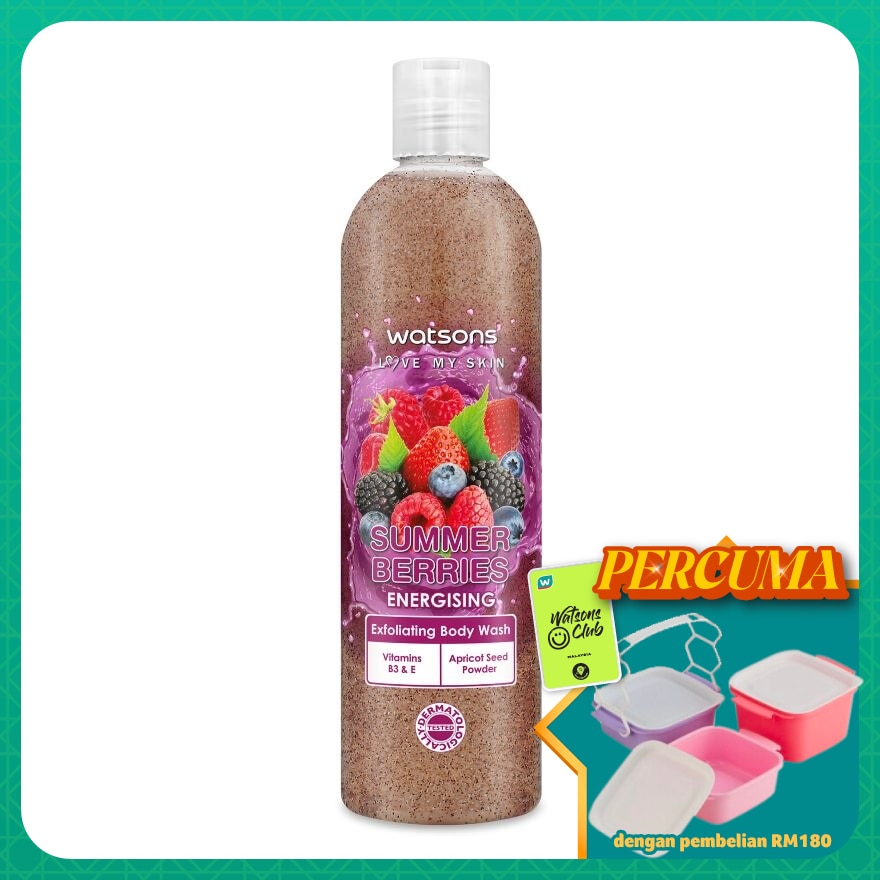 Aqua, Sodium Laureth Sulfate, Palm Kernelamide DEA, Cocoamidopropyl Betaine, Sodium Chloride, Parfum, Prunus Armeniaca (Apricot) Seed Powder, Hydrated Silica, Glycerin, DMDM Hydantoin, Citric Acid, Tetrasodium EDTA, Polyquaternium-7, Gellan Gum, Sodium Benzoate, Propylene Glycol, Butylene Glycol, Niacinamide, Simmondsia Chinensis (Jojoba) Seed Oil, Tocopheryl Acetate, Vaccinium Myrtillus Fruit Extract, Rubus Idaeus (Rasberry) Fruit Extract, Vaccinium Oxycoccos Fruit Extract, Fragaria Vesca (strawberry) Fruit Extract, Potassium Sorbate, Linalool, CI 16035, CI15985, CI 42090, CI 42053
