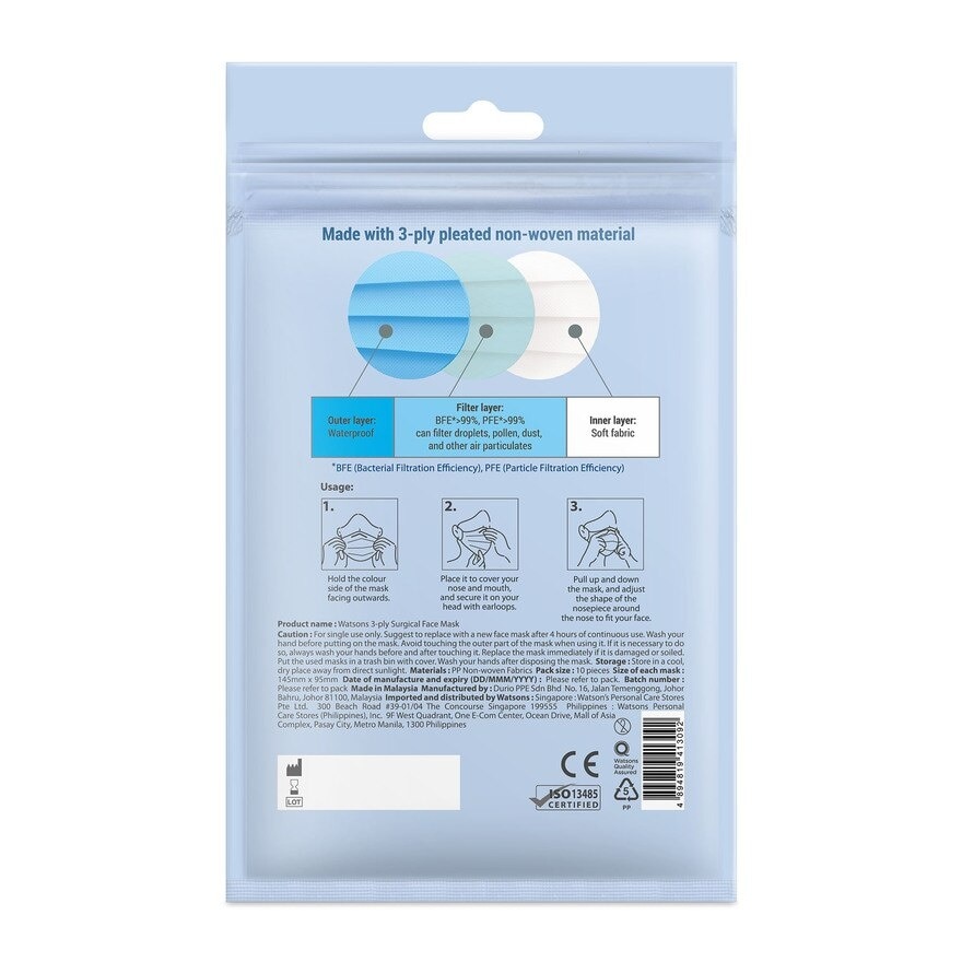 Watsons Surgical 3Ply Face Mask Kids 10s can filter droplets, pollen, dust and other air particulates. BFE/PFE>99%. Registered Under Act 737. MD Registration number: GA10955724-172780 Advertisement Approval number: MDAMD072/2026