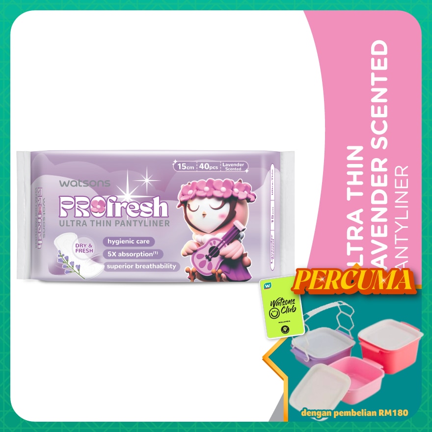 Watsons Ultra-Thin Pantyliner Lavender Scented 15Cm Is More Contoured And Flexible For Better Fit And Added Comfort.